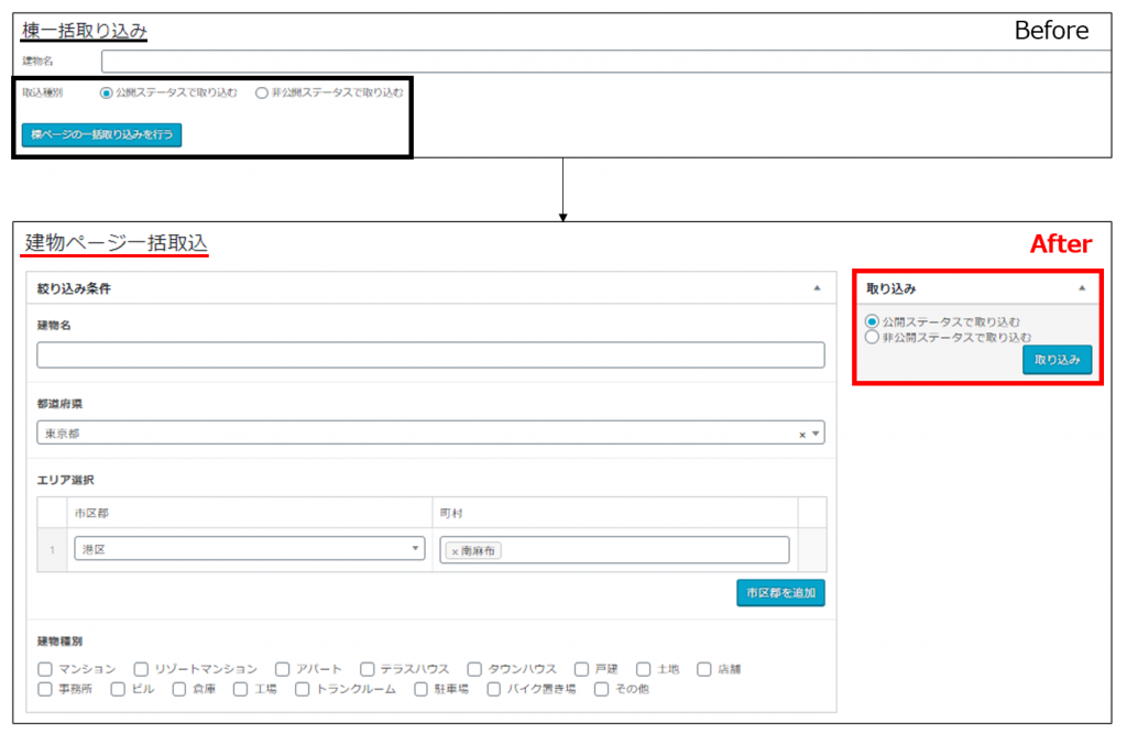 建物一括取込に「エリア」「建物種別」の絞り込み項目を追加します。