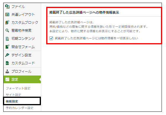 表示しない場合は[設定>機能設定>掲載終了した広告詳細ページへの物件情報表示]にて