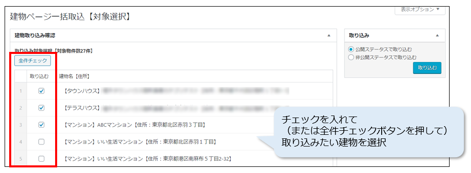 2. 【建物一括取込】建物を選択して取り込めるようにします
