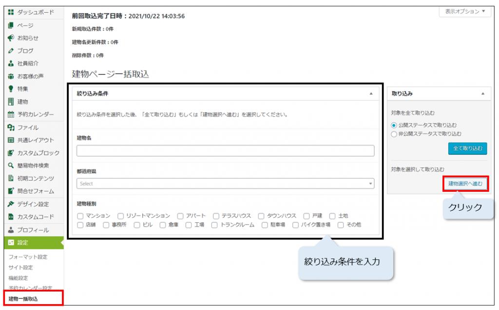 ①設定>建物一括取込を開き、絞り込み条件を入力します。