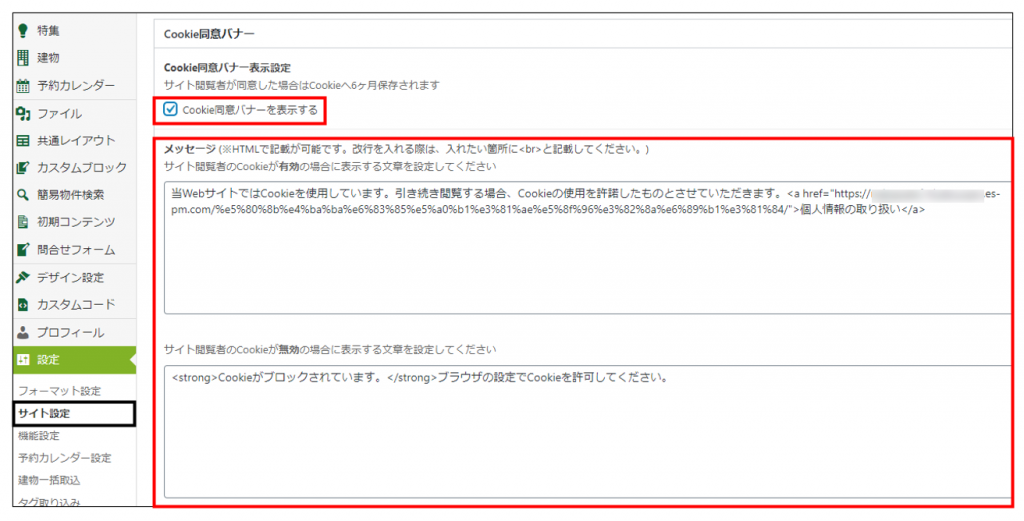 「Cookie同意バナーを表示する」にチェックを入れ、