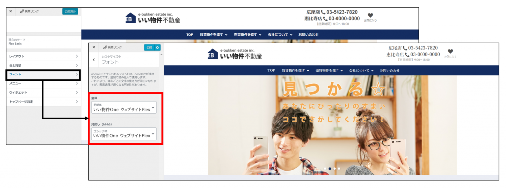 デザイン設定の画面にフォント項目を追加し、サイト全体と見出しのフォントをそれぞれ変更できるようになります。