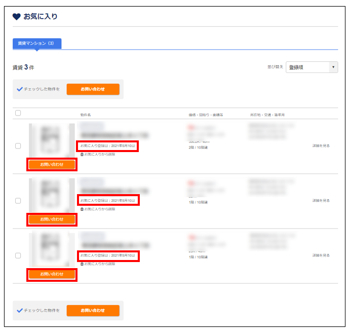 各物件ごとにお問い合わせボタンが表示されるようになります。