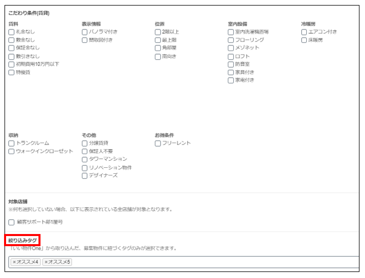 ESいい物件Oneから取り込んだ、”ページごとに設定可能なタグ”については「絞り込みタグ」に名称を変更いたします。