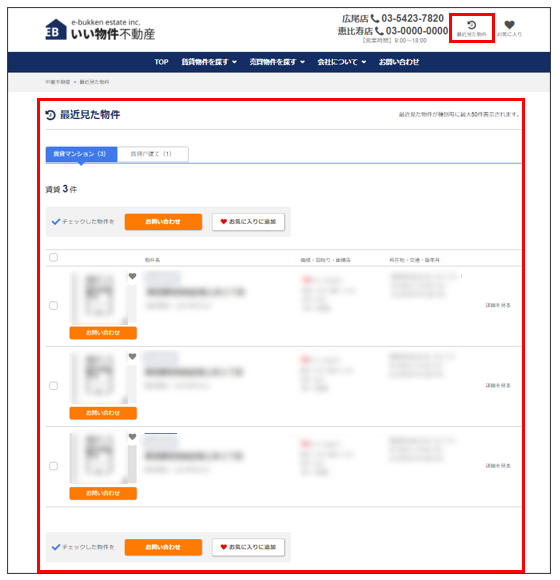 公開サイト右上のアイコンから「最近見た物件」の一覧が開けるようになります。