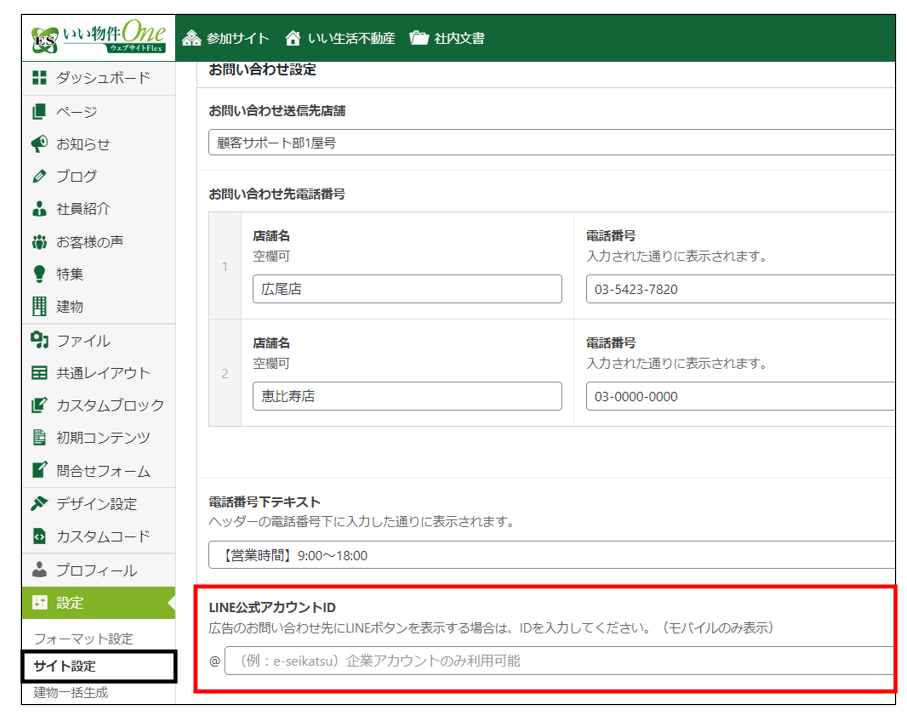 「LINEで相談(無料)」ボタンを表示させる場合は、LINE公式アカウントIDを設定してください。