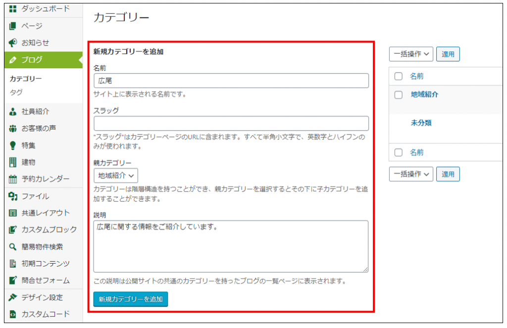| 親カテゴリー | 子カテゴリーの追加時のみ指定します。 選択肢には既に追加済みのカテゴリーが表示されます。 サイト上のパンくずでは、親カテゴリー>子カテゴリーのように階層表示されます。 |