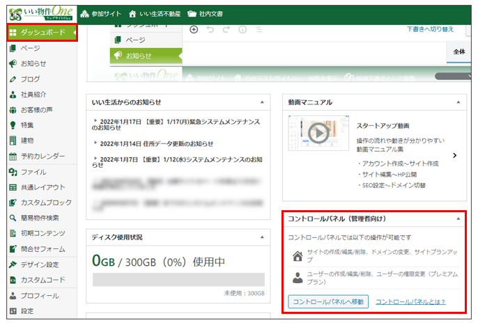 ダッシュボードにコントロールパネルに関する枠を表示し、