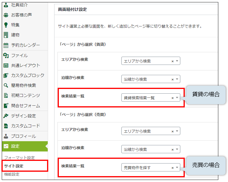 既成ページの項目で「賃貸検索結果一覧」or「売買検索結果一覧」を選択し、レイアウトを設定します。