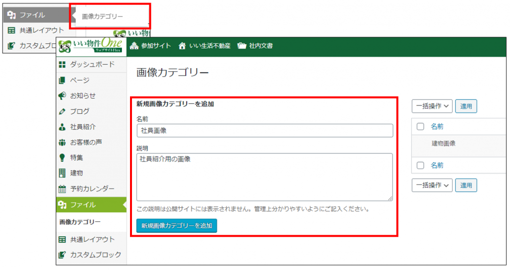 尚、既存カテゴリーの「建物画像」は編集や削除ができません。