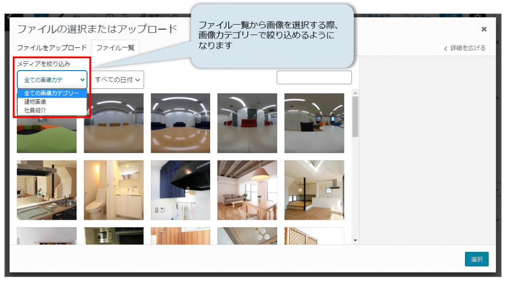※画像カテゴリーが設定されているor設定されていないの検索や、「建物画像”以外”」といった除外検索も可能 - 画像ブロックで画像を選択する際も、画像カテゴリーで絞り込めるようになります