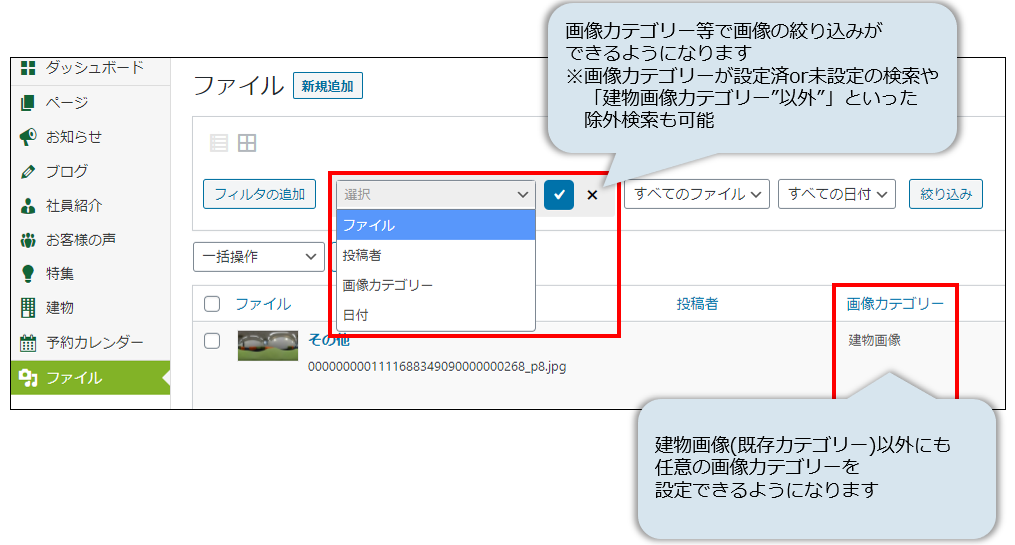 - それに伴い、ファイル一覧に、画像カテゴリー等で絞り込める機能を追加します