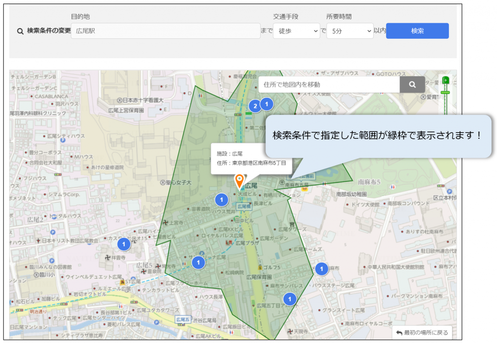 - 所要時間検索とは、特定の施設や住所までの移動に必要な時間を元に、物件を検索できる機能です。