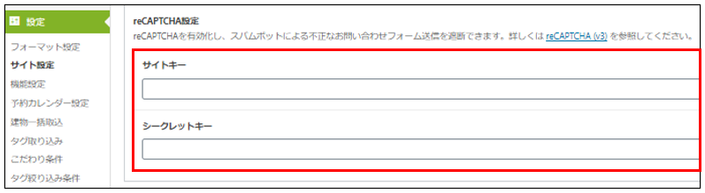 設定>サイト設定>reCAPTCHA設定に入力してください。