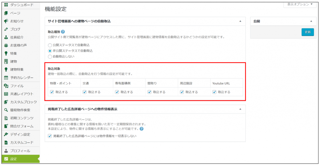- 機能設定>「サイト管理画面への建物ページへの自動取込」を自動取込する設定にしている場合、