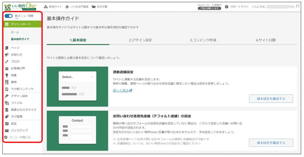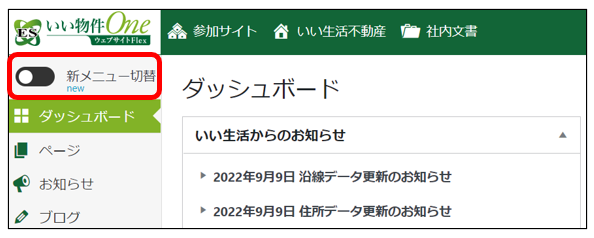 管理画面左上の「新メニュー切替」をONにすることで、いつでもご利用いただけます。