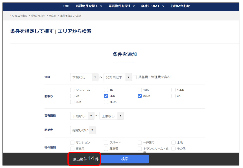 物件検索画面に条件に該当する物件数がリアルタイムで表示されるようになり、