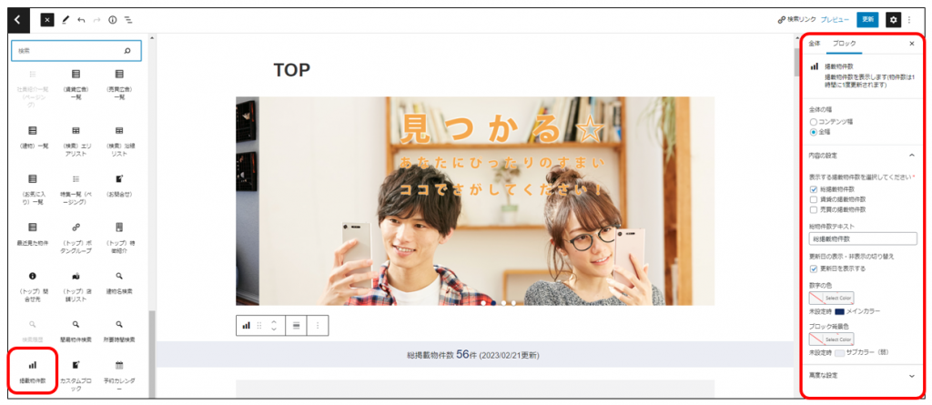 2.任意の個所に「掲載物件数」ブロックを挿入します。
