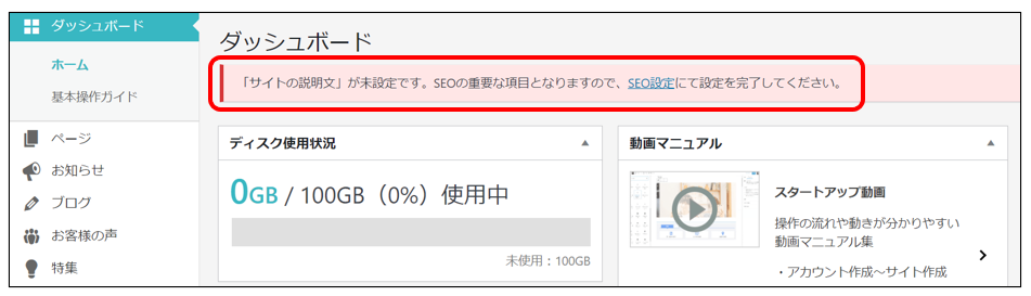 SEO対策の観点から、SEO設定の「サイトの説明文」項目を入力必須に変更いたします。