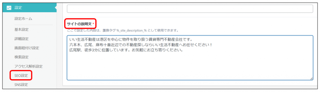 1. SEO設定において「サイトの説明文」を入力必須化します