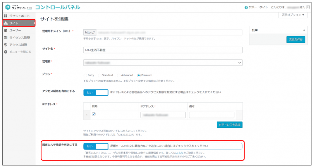 設定項目:コントロールパネル>サイト>編集>顧客カルテ機能を有効にする