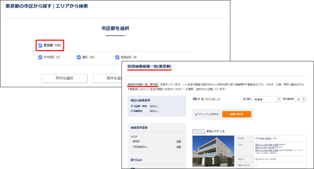 エリア・沿線検索の市区郡選択画面で都道府県にチェックを入れて