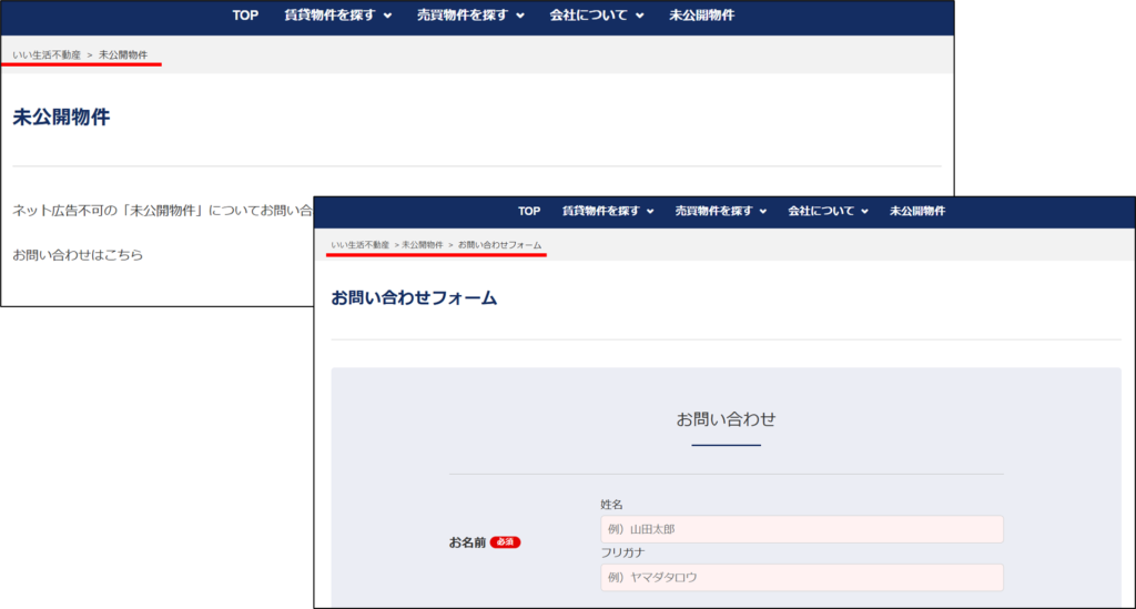 ⇒パンくずリストは「(サイト名) > 未公開物件 > お問い合わせフォーム」になる