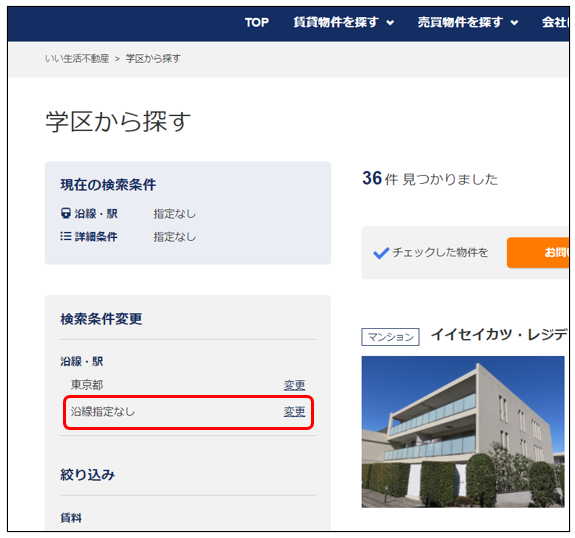 市区郡・沿線が未選択の時も、検索結果一覧に市区郡・沿線の変更項目が表示されるようにします。