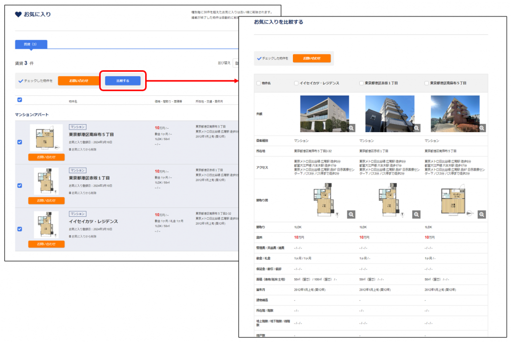 ・気になる物件の賃料(価格)、交通情報、建物情報などを簡単に比較できるようになります!