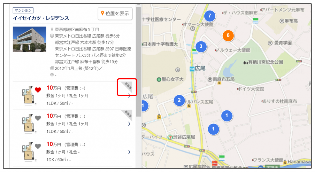 以下画面において閲覧済みの物件にマークを表示し、物件を探しやすくします。