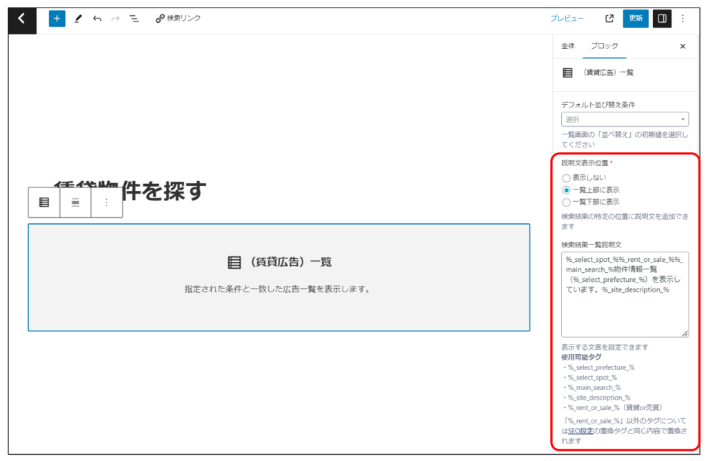 SEO対策の一環で、物件の検索結果一覧画面にサイト説明文など、任意の文言を表示できるようにします。