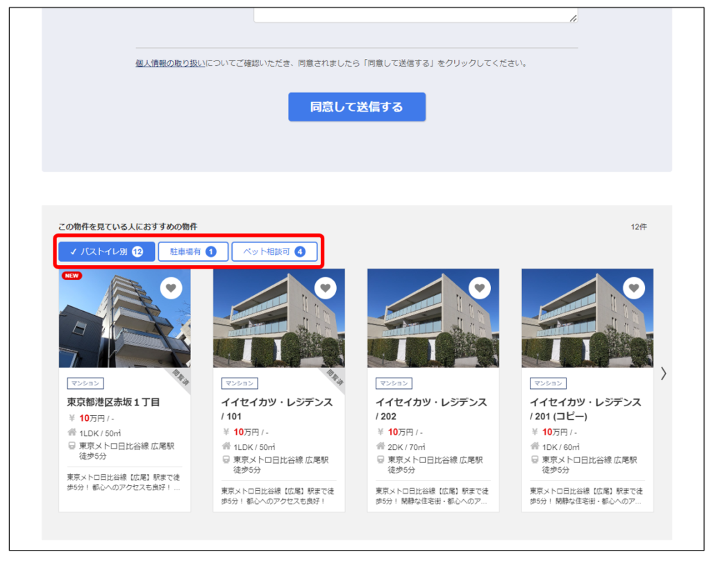 主要設備を指定している場合、類似物件の上部に設備名のボタンが表示されます。