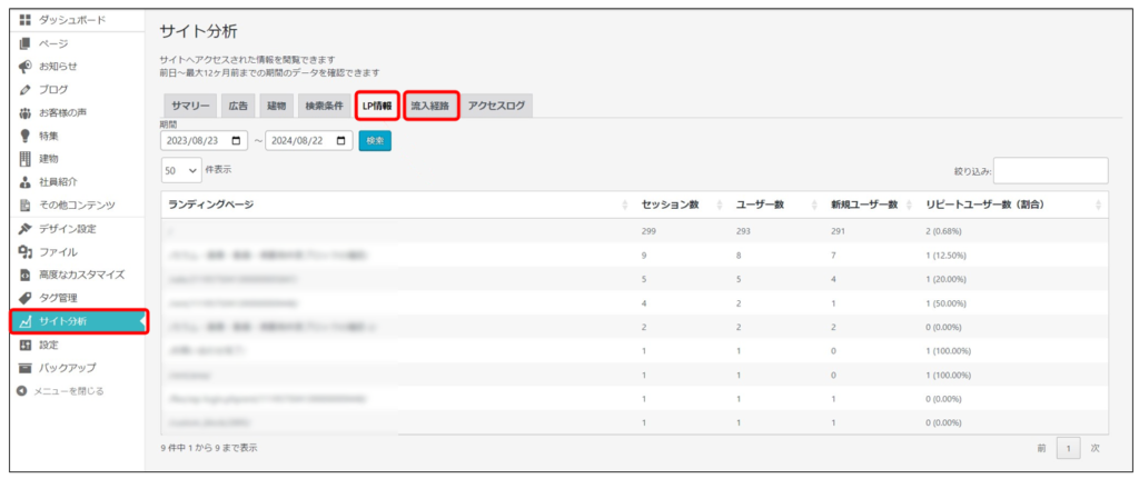LP(ランディングページ)と流入経路の情報が確認できるようになります。