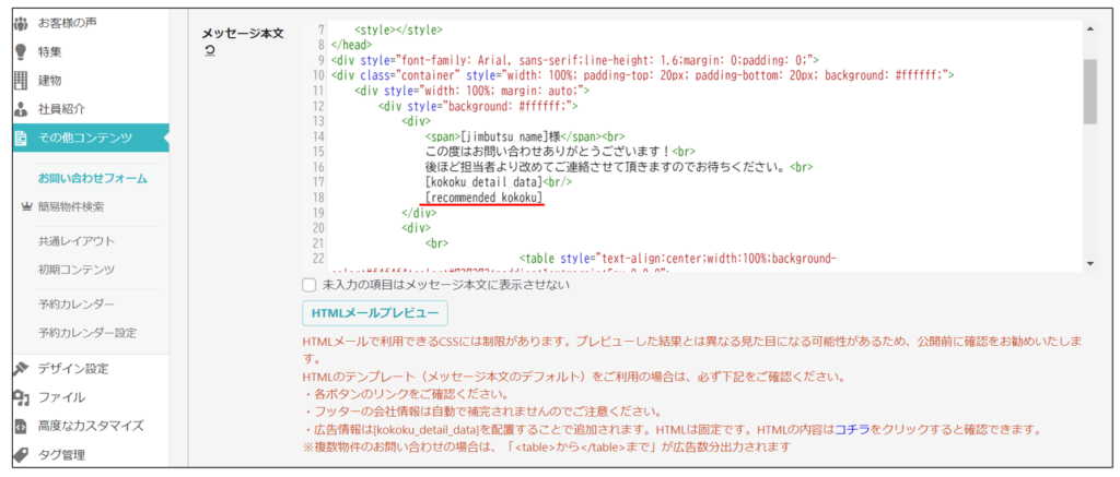 以下画面で「メッセージ本文」に[recommended_kokoku]タグを入力すると、おすすめ物件が表示されるようになります。