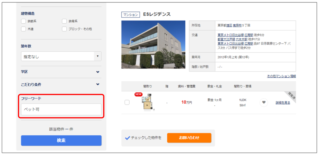 物件の検索結果一覧と特集一覧の「フリーワード」欄で