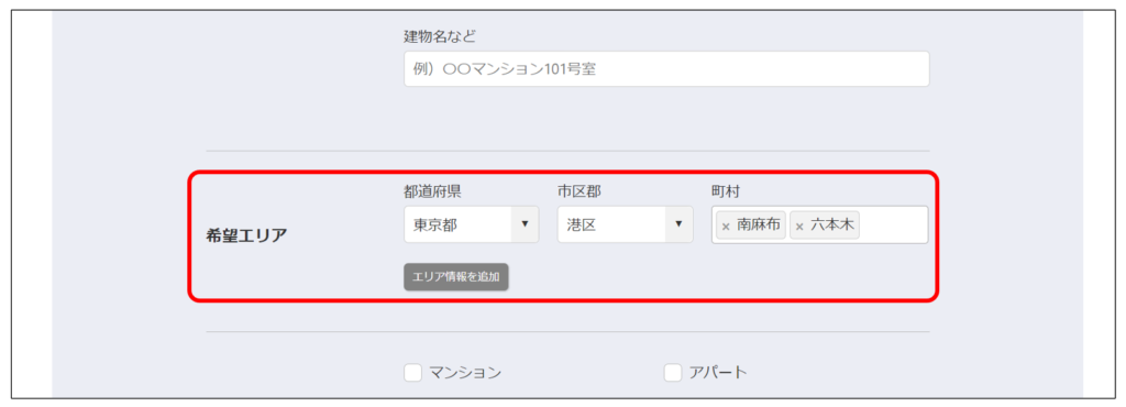 「希望エリア」の項目を追加し、エンドユーザーに希望エリア情報の入力を促します。