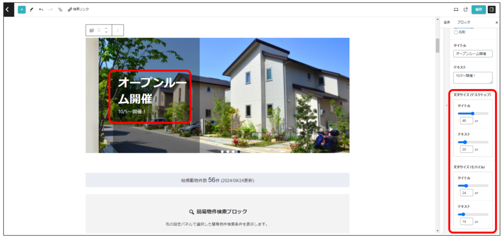 スライダーブロックに表示するキャプション(タイトル・テキスト)の文字サイズを調整できるようになります。