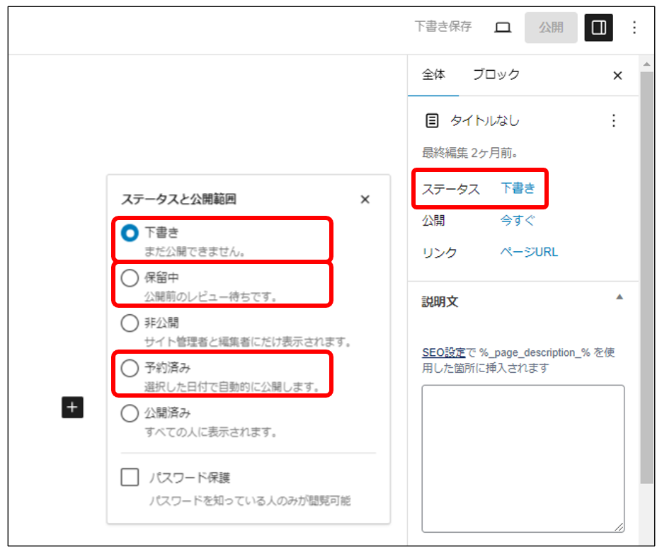 ページの公開ステータスに「下書き」「保留中」「予約済み」が追加されます。