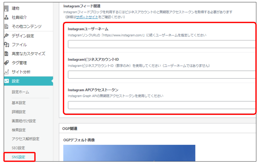 5.取得した情報をウェブサイトFlexの[設定>SNS設定>Instagramフィード関連]に設定