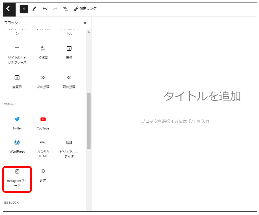 6.フィードを表示したいページの編集画面で「Instagramフィード」ブロックを追加