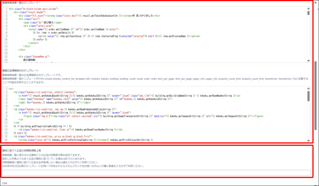 - 「賃貸/売買検索結果一覧のテンプレート」に以下コードを記載しない限り、