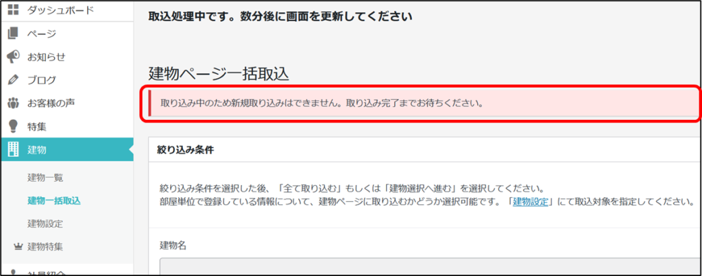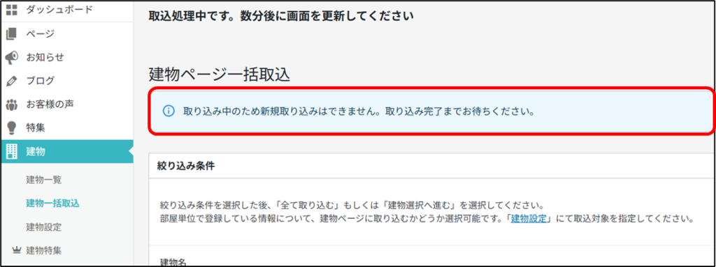 表示例2:建物ページ一括取込時のメッセージ(説明)