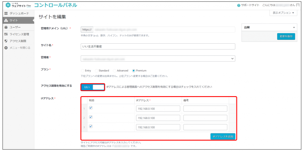 Premiumプランをご利用の場合、以下画面へのアクセスをIPアドレスで制限することができます。