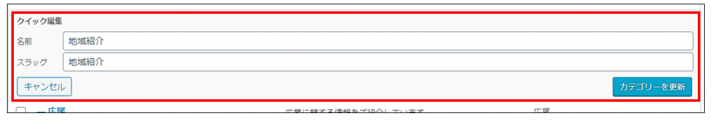 「クイック編集」ではカテゴリーの名前、スラッグのみを編集できます。