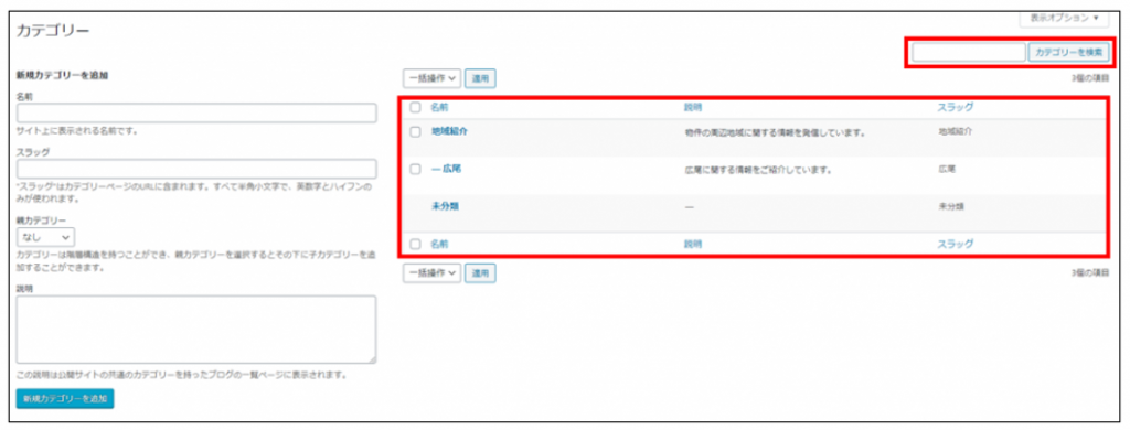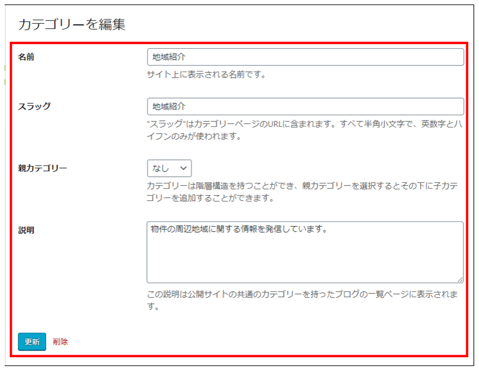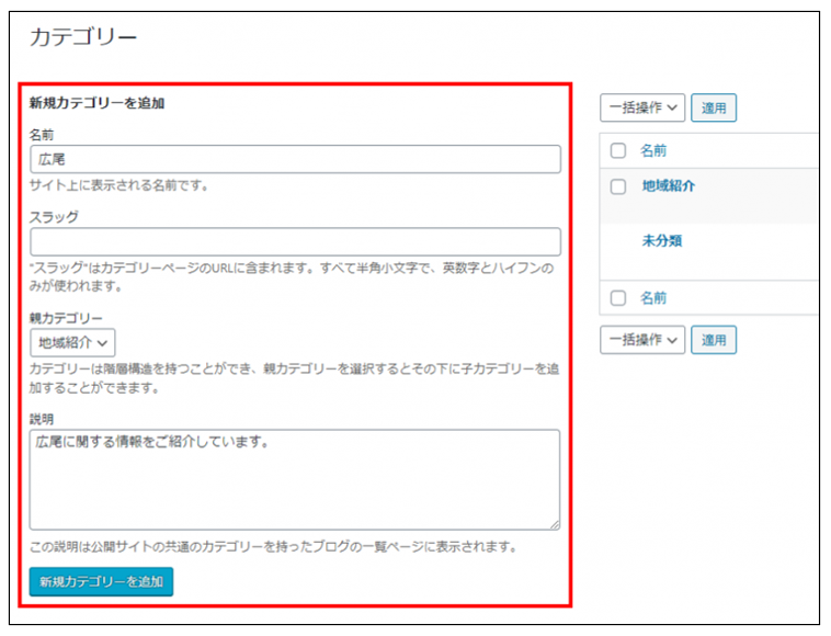 | スラッグ | カテゴリーページのURLに含まれます。 未設定の場合はカテゴリー名がURLに利用されます。 |