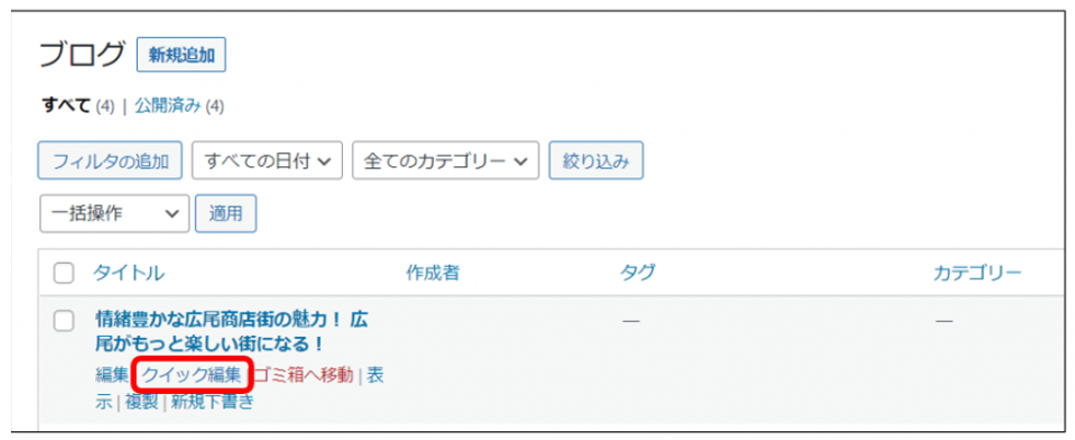 1.ブログ一覧でカテゴリーを付与したい記事にカーソルを合わせ「クイック編集」をクリック