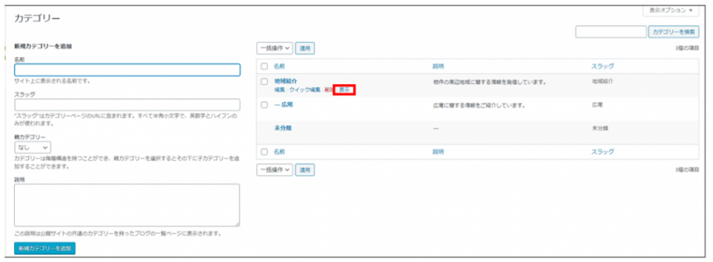 カテゴリーにカーソルを合わせ、「表示」を押すと