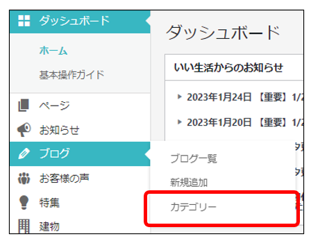 登録されているカテゴリーは、ブログ>カテゴリーで確認できます。