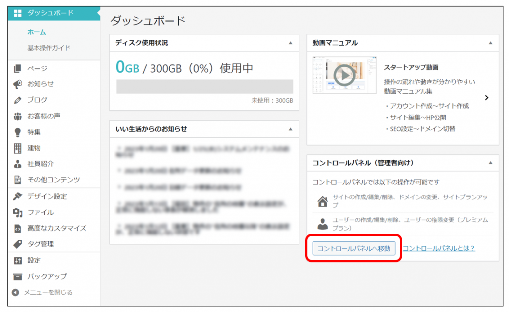 ※管理画面のダッシュボードの「コントロールパネルへ移動」からもログイン可能です。