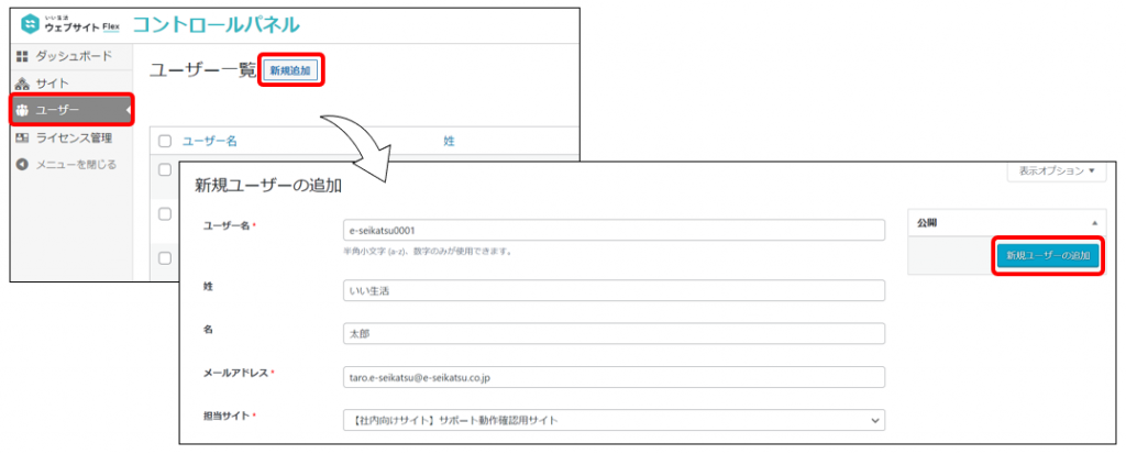 サイト管理を複数名で行う場合には、コントロールパネルでユーザー追加をします。